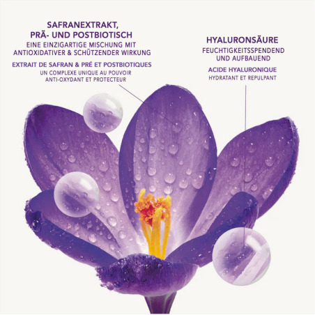 Extract of saffron petals, a unique herbal active ingredient, has proven its efficiency on signs of aging. With a naturally high content of flavonoids, crocines and phenolic components, it acts as an antioxidant shield that combats the harmful effects of oxidative stress caused by everyday environmental factors. Furthermore, it is a powerful ally against "inflamm-aging" or inflammation aging, which is responsible for premature aging of the skin and is also triggered by harmful external influences.