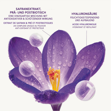 Extract of saffron petals, a unique herbal active ingredient, has proven its efficiency on signs of aging. With a naturally high content of flavonoids, crocines and phenolic components, it acts as an antioxidant shield that combats the harmful effects of oxidative stress caused by everyday environmental factors. Furthermore, it is a powerful ally against "inflamm-aging" or inflammation aging, which is responsible for premature aging of the skin and is also triggered by harmful external influences.