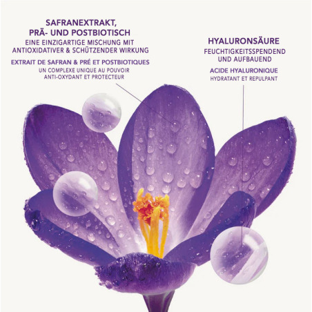 L'estratto di petali di zafferano, un ingrediente botanico unico, ha dimostrato la sua efficacia sui segni dell'invecchiamento. Con un contenuto naturalmente elevato di flavonoidi, crocine e componenti fenolici, agisce come uno scudo antiossidante che combatte gli effetti nocivi dello stress ossidativo causato dai fattori ambientali quotidiani. Inoltre, è un potente alleato contro l'"inflamm-ageing" o invecchiamento infiammatorio, responsabile dell'invecchiamento precoce della pelle e innescato anche da influenze esterne dannose.